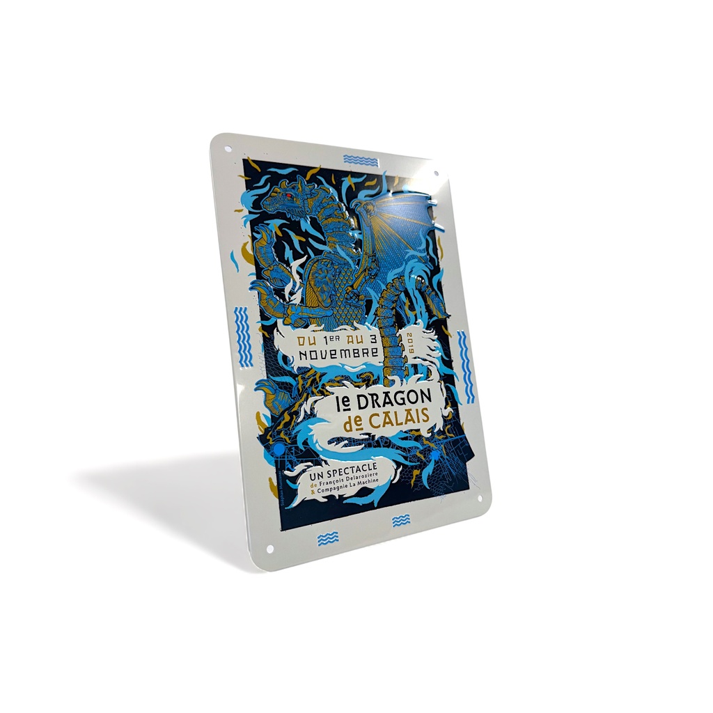 Cette plaque de métal décorative à fixer au mur reprend l'emblématique affiche qui annonça l'arrivée du Dragon de Calais dans un grand spectacle en novembre 2019. L'illustration de l'artiste Stephan Muntaner est soigneusement imprimée et embossée dans le métal pour un relief du plus bel effet.